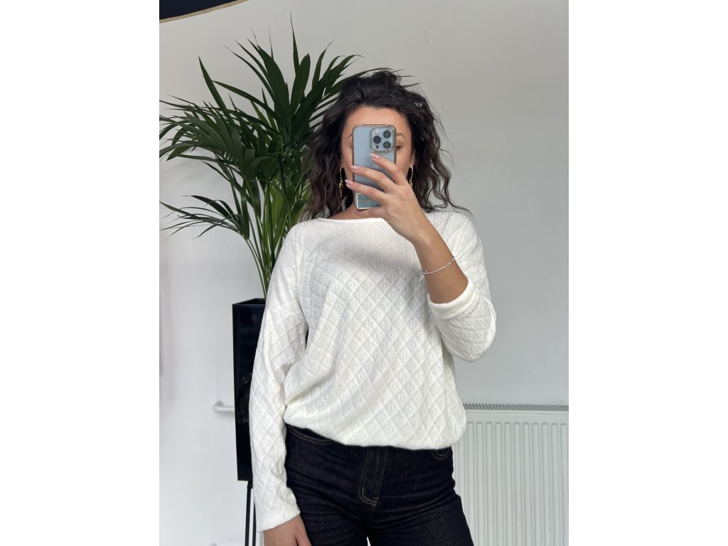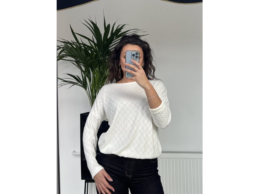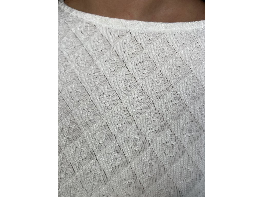 Biele tričko s jemným vzorom a gumičkou v páse pôsobí čisto a upravene.