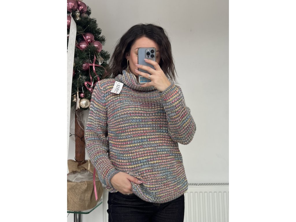 Farebný rolákový sveter pôsobí živo a príjemne.